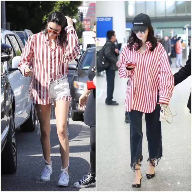 中外带货女王往往思路接近,金小妹和杨幂最近都穿了红白竖条纹衬衣。