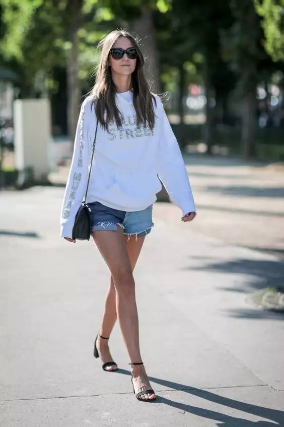 之前搭姐就推荐过,卫衣是这个早秋可以承包外套和内搭的绝佳之选,搭配牛仔短裤,视觉上厚下薄的季节冲撞充满了时髦气息。▼
