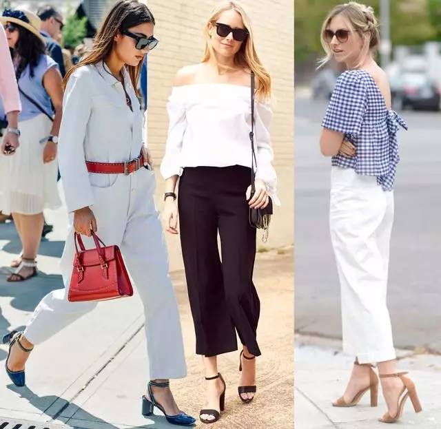 颜色当中,黑色的一字带方跟凉鞋是最受欢迎的,搭配礼服式的裤装造型显得很是干练。