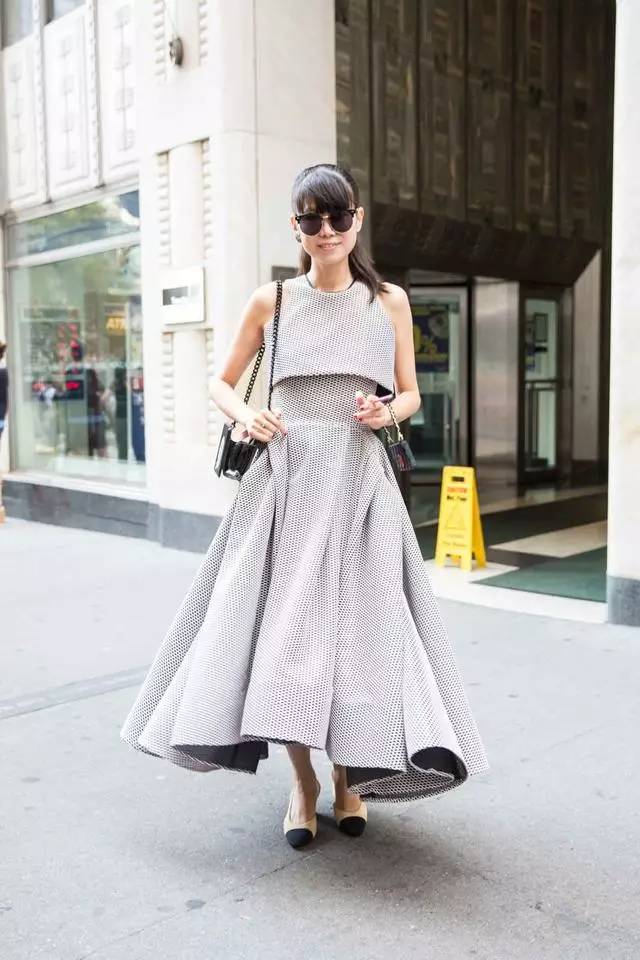 洋装不一定要配高跟鞋的,搭配方跟鞋也可以优雅迷人。夏季喜欢裙装的你,穿上这样一身去约会或是参加好友聚会一定很美~!
