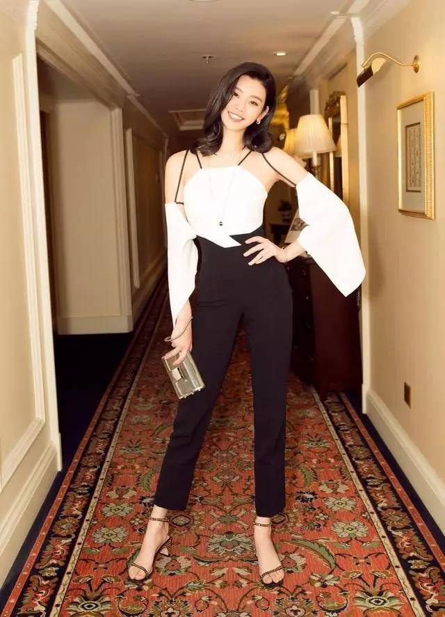 搭配白色上衣和高腰直筒裤,打造修长的双腿,简单的大色块更突显造型的大方。