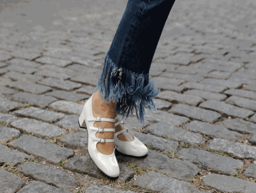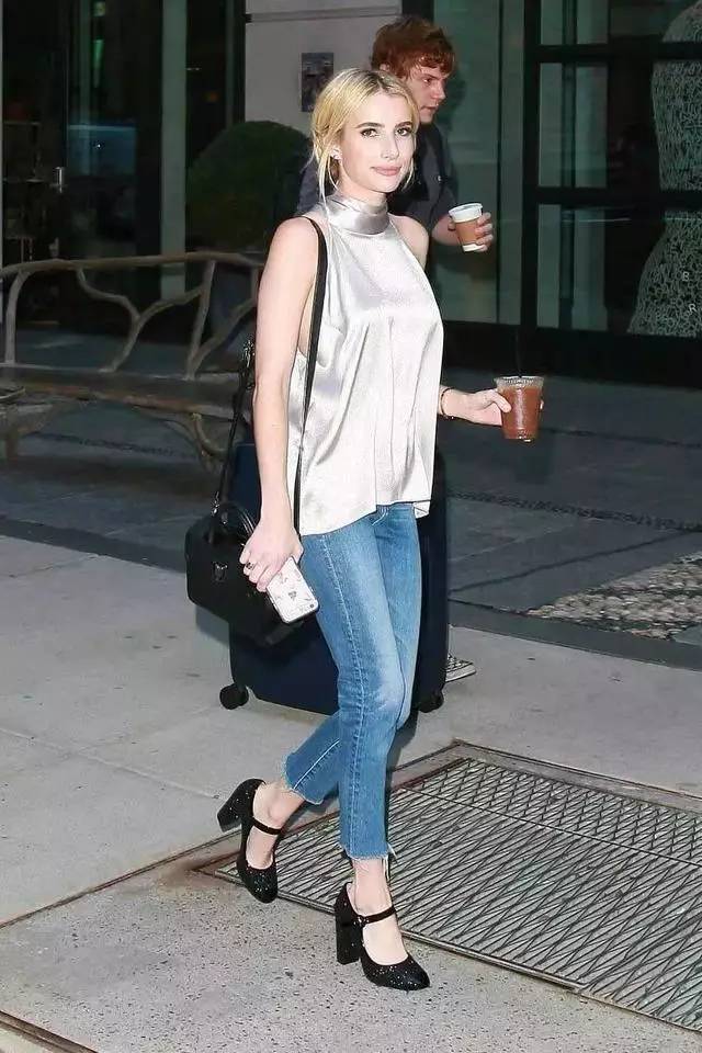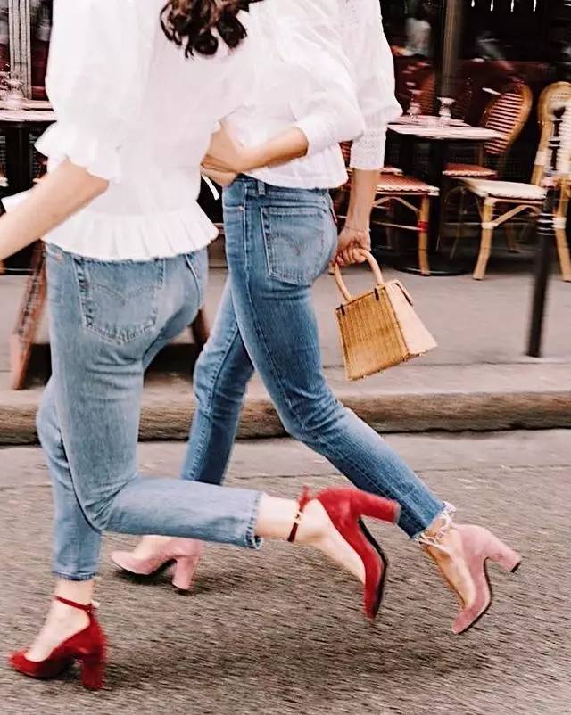 搭配方跟鞋感觉整个人衣品都上升了,毛边牛仔裤与一字领露肩衬衫的休闲风格,搭上这双经典的方跟鞋亦是清爽无比。