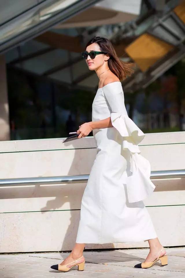 白色荷叶边露肩连衣裙 拼接粗跟鞋,充满了女性的知性气息。