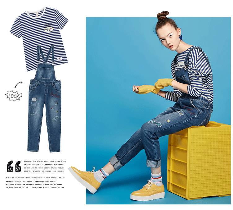 背带裤绝对是穿出青春减龄少女气质的人气装备!它充满童趣和稚气,俏皮可爱,和休闲百搭的白T、显瘦好穿的条纹T,配一脸的耐看时髦,将一边背带解开,搭配小白鞋,你的元气要溢出界了。