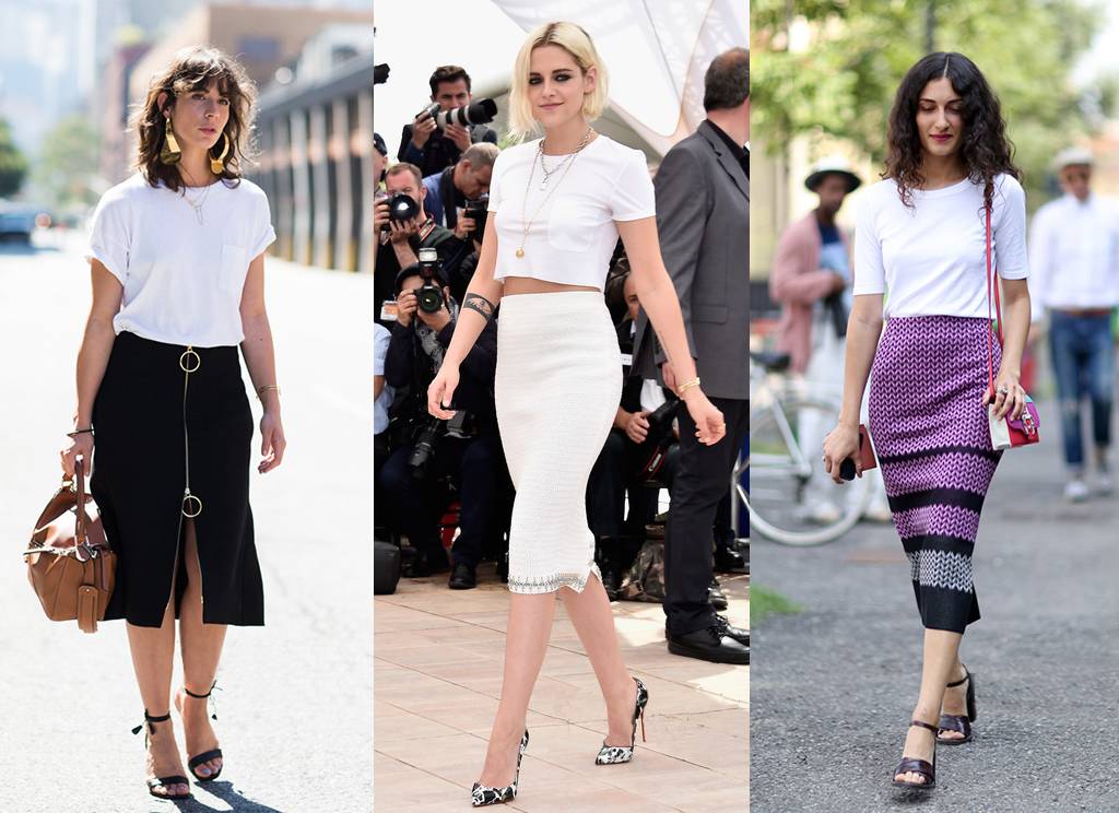 白T A字短裙,让娇小女生也有好比例,高腰A字裙有拉伸下半身比例的作用,皮革或亮色的A字裙能很好的跟T恤的朴素相中和,这身搭配充满OL风,又不会显得过于死板。