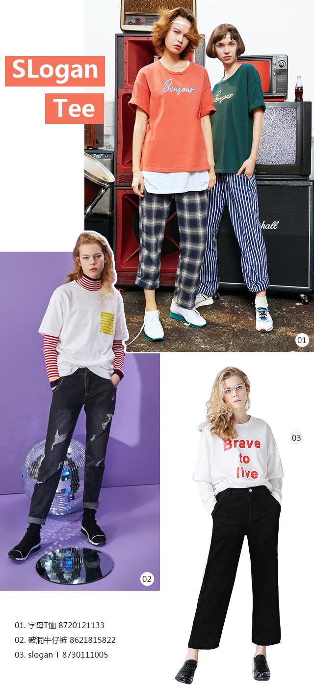 想成为街头最抢镜的时髦girl,slogan T是一个简单直接表达自我的途径。将鲜明态度和潮流精髓融入基本款T恤,穿上率性不羁的破洞牛仔裤,打造cool girl的运动休闲风。