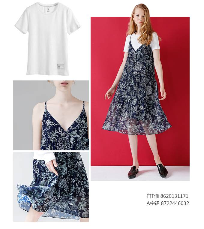 白T恤简单百搭,配吊带连衣裙清新大方又不会显得单调,这样穿看着更年轻。充满浪漫气质的吊带碎花裙,不收一件是在是辜负了夏天。