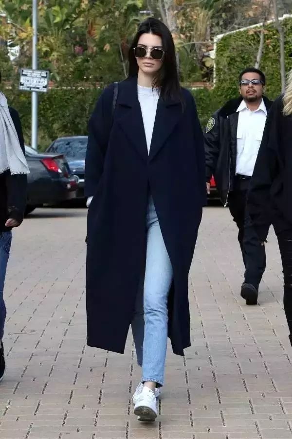 KK用浅灰色内搭和深灰色大衣来搭配出层次感。下身么,和上一张图差不多,看样子这种大衣 水洗牛仔裤(颜色别太深) 小白鞋的搭配可以成套路了。