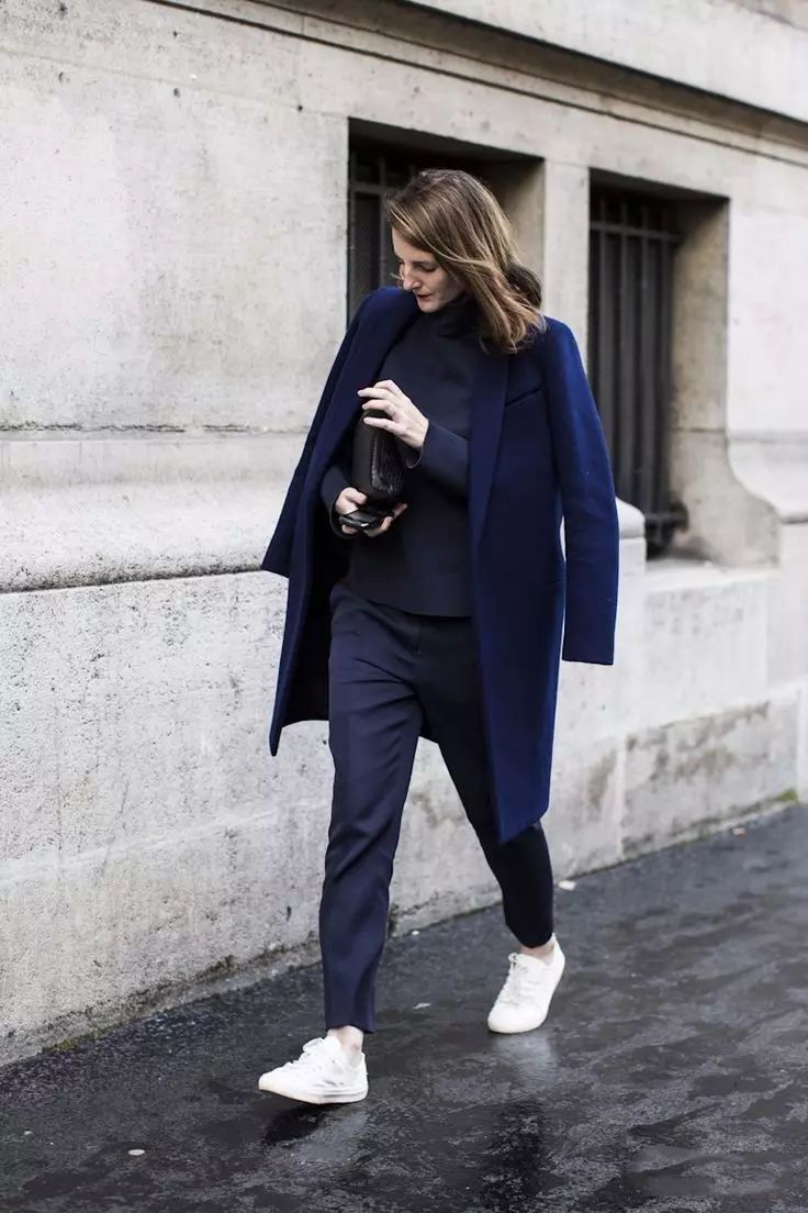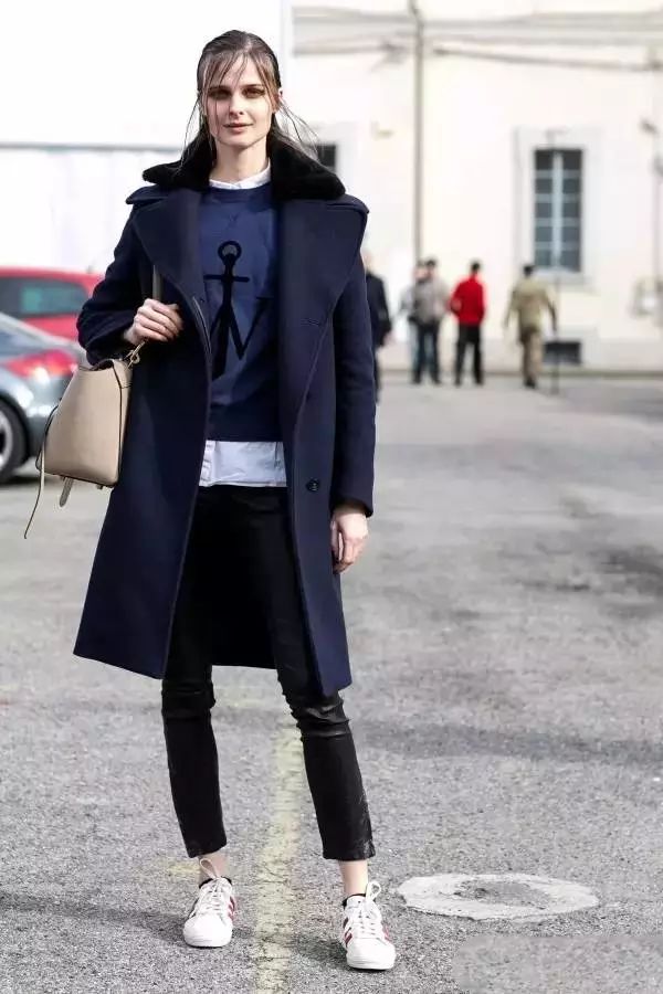 深蓝色大衣配相近色的西裤本来是很成熟的穿搭,然而脚上的小白鞋却有很好的减龄效果。