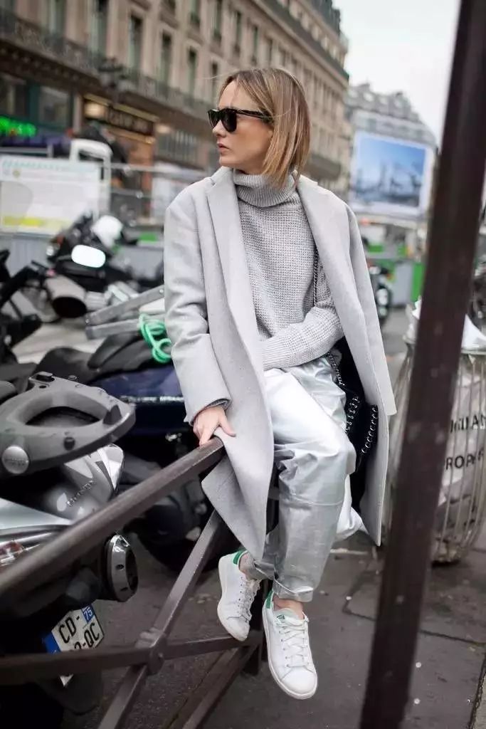 淡雅的灰色大衣和灰色针织衫,如果只是搭配小白鞋还有点素,但是有那条发亮的银色裤子就不一样了呢。