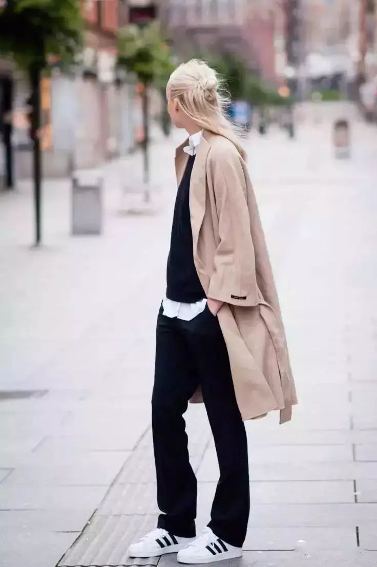 浅驼色大衣配小白鞋有种格外明媚的感觉,也很洋气呢。小脚裤配大衣效果没的说。