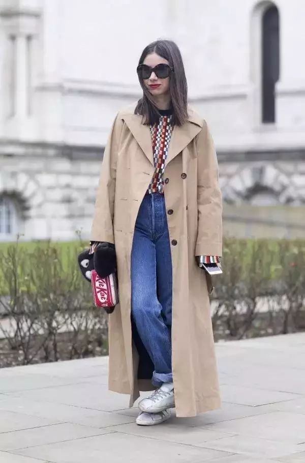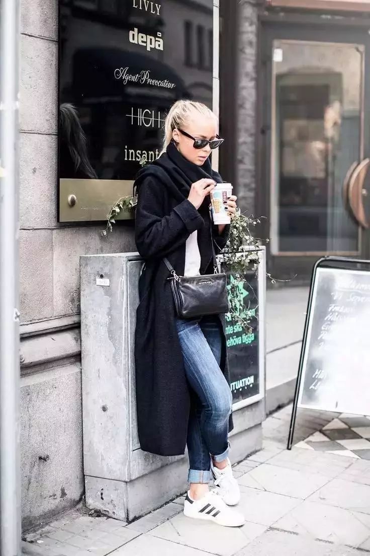 略深的灰色大衣和深蓝色的毛衣搭配容易显老气,不过穿上减龄的水洗牛仔裤和小白鞋却不会有这种感觉,只觉得时髦。