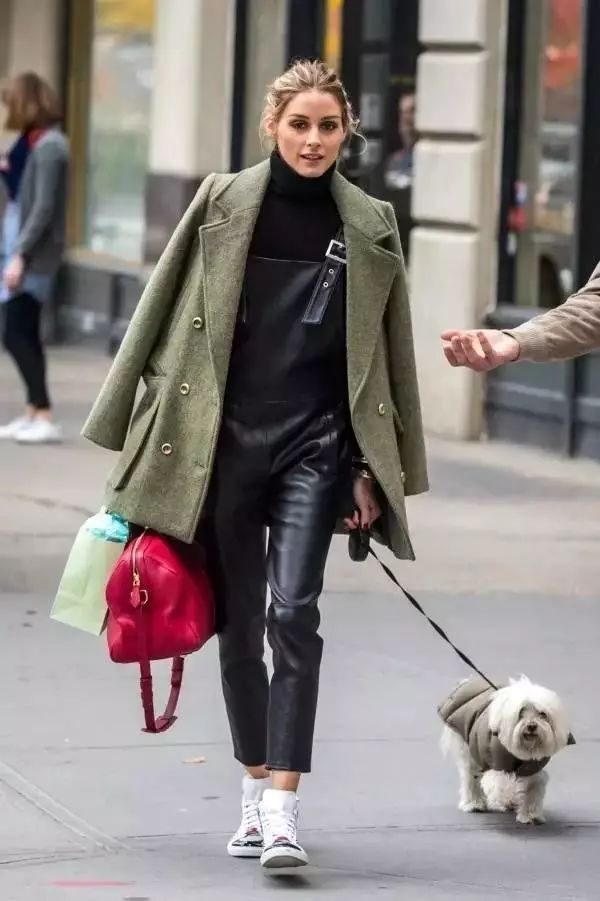 注意领子的颜色和鞋子是呼应的。有时候要呼应颜色也只需要小面积的颜色一致就好了。大衣、皮裤、墨镜还是那么酷。