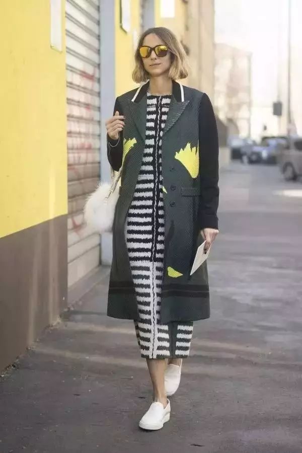 很个性的搭配,有图案的大衣和有图案的连衣裙自带设计感,其他单品已经够丰富的情况下,鞋子配简单的白色一脚蹬就很好。