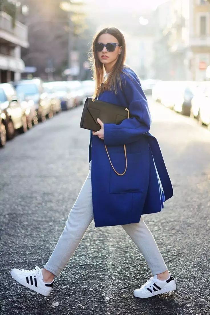 下图中蓝色大衣配灰白色运动裤和小白鞋感觉很精神,可能因为运动感吧,就是穿了大衣也还是藏不住的!