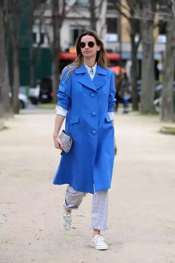 下图中模特内搭的衣服裤子、脚上的小白鞋都有图案,如果大家有兴趣用蓝色大衣和小白鞋搭配,搭姐倒觉得衣服裤子和鞋子都是纯白挺好。再加点配饰什么的丰富就好了。