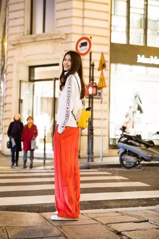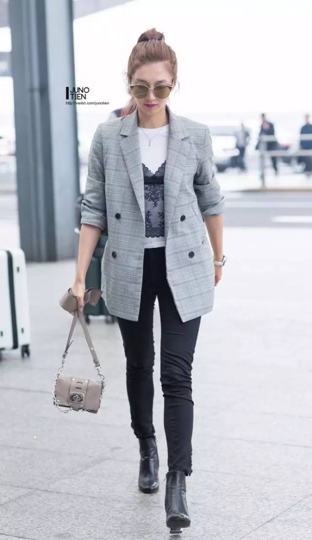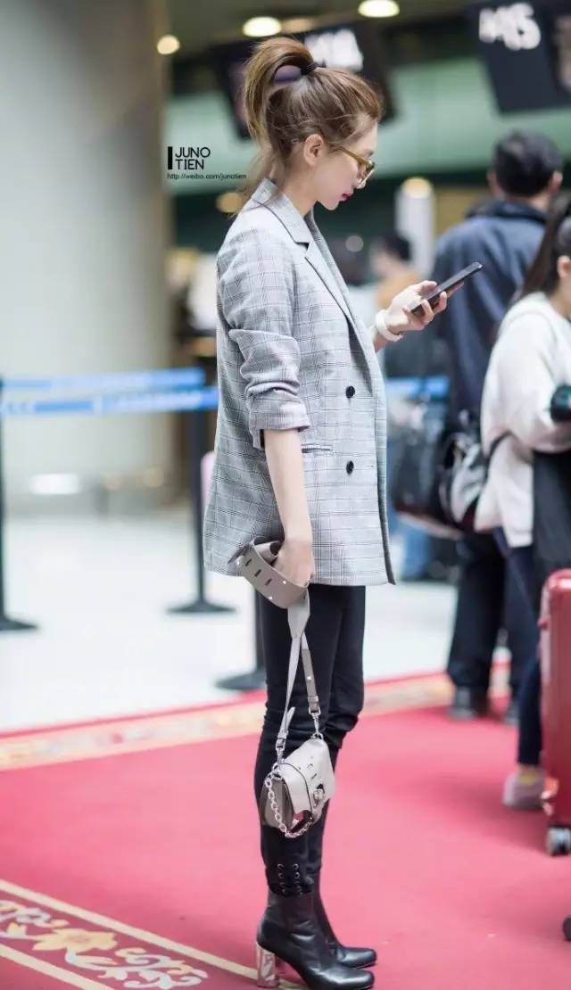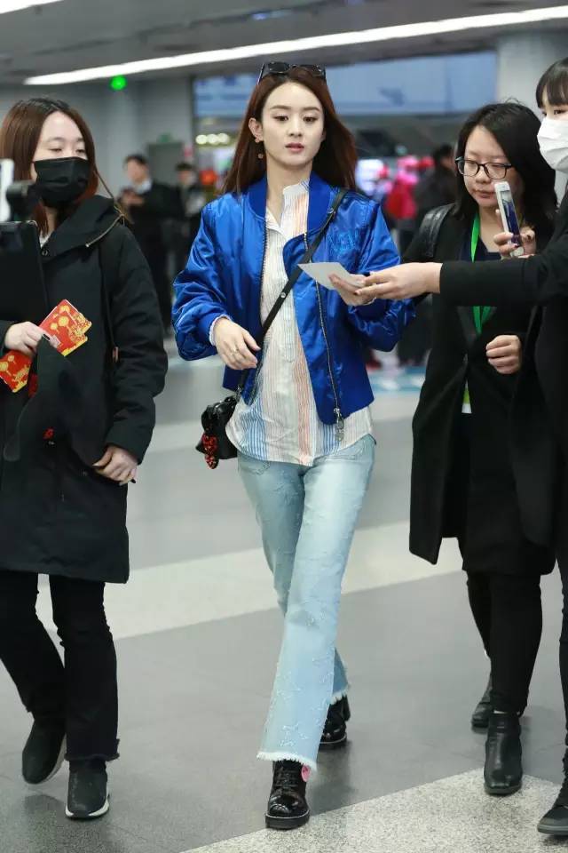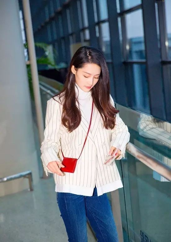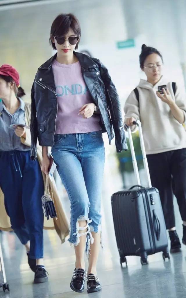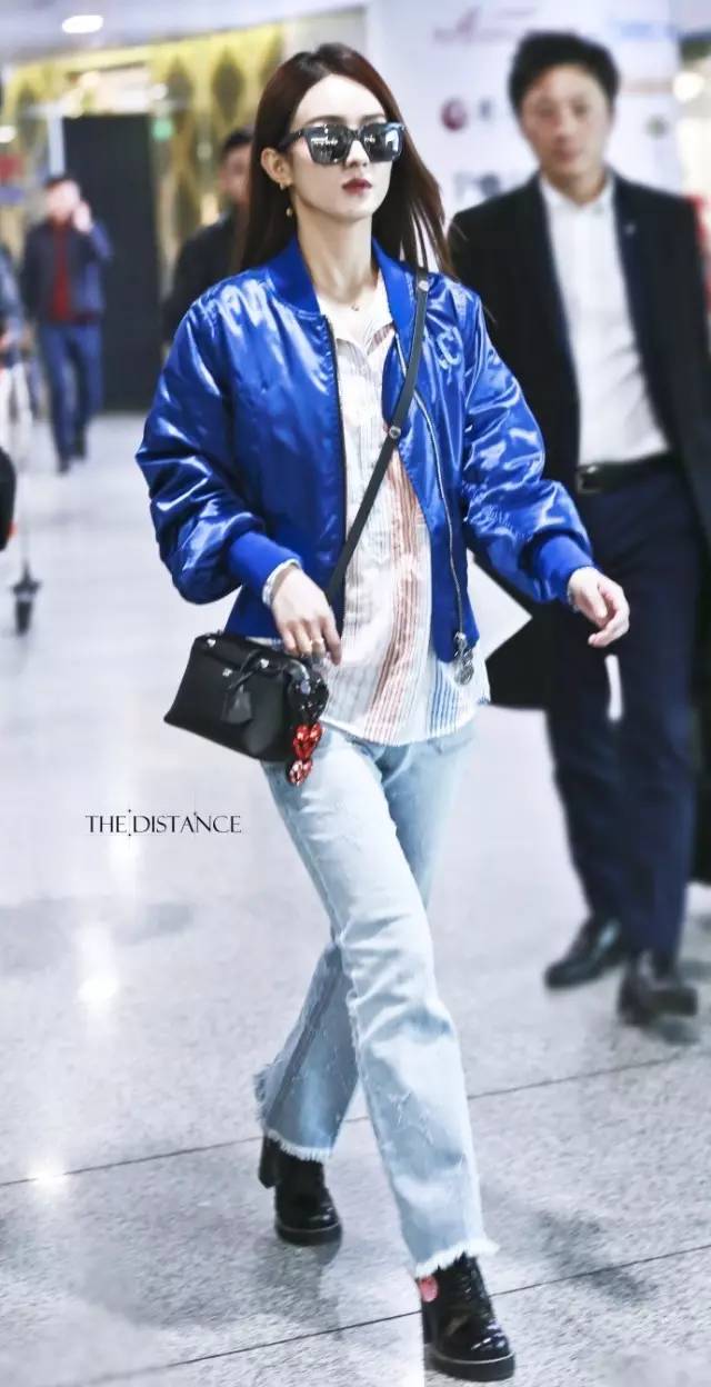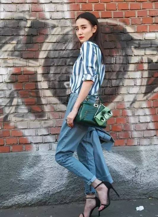 杨幂oversized的条纹衬衣搭配破边的牛仔裤
