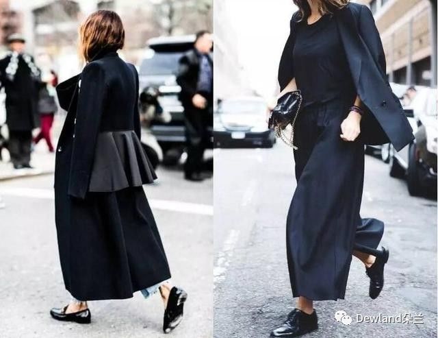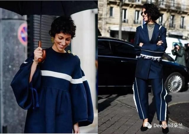 全身的海军蓝的搭配,利用白色或者灰色来点缀一下,增添几分轻盈感。