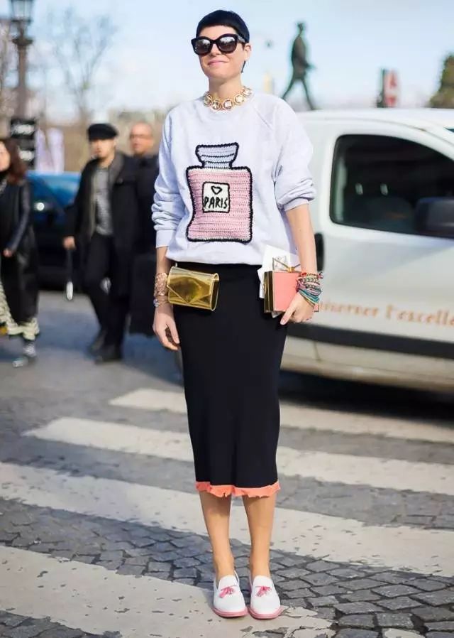 铅笔裙修饰身材显瘦无敌,卫衣的廓形感让帅气加倍。