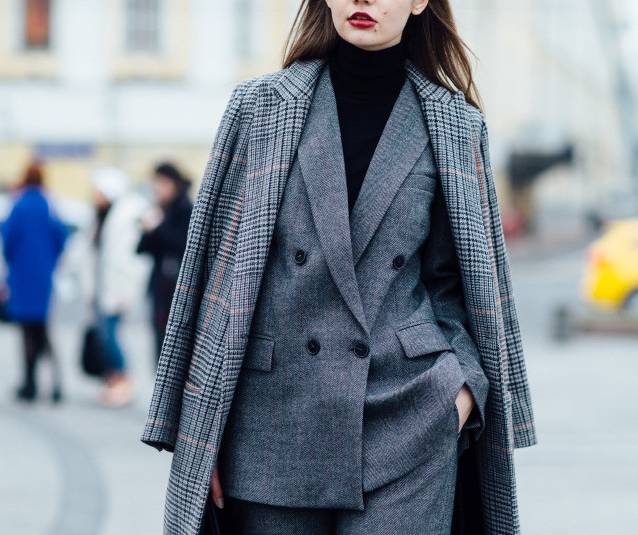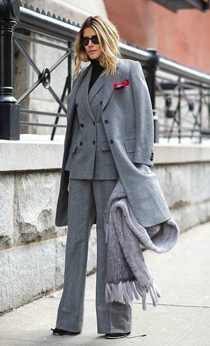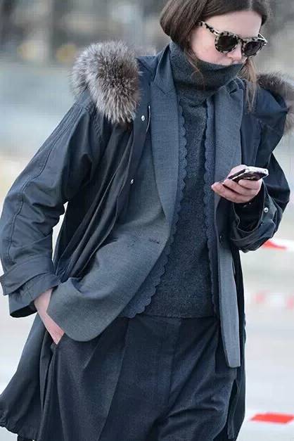 如果你是个气场十足的人,不妨试试整身灰的搭配。一定会让你变得更加“高冷”。整套西服外再加个灰色西服外套,层层叠加显得更有质感,手上再拎个浅灰色厚围脖与整套造型相呼应。