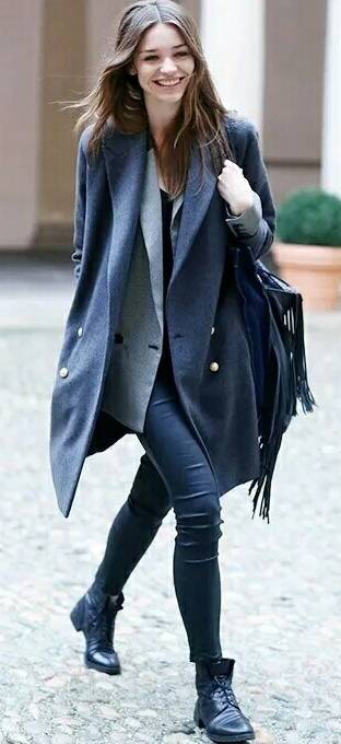 西服搭配牛仔裤搭配短靴的设计很洒脱,此时在最外面加一件呢子大衣很凸显帅气个性。