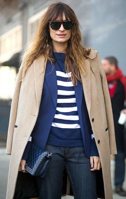 藏蓝色西服很显肤色白,外加一件驼色的大衣,形成颜色的视觉反差更有看头,最外面的大衣不必穿上,披在肩上就刚刚好。