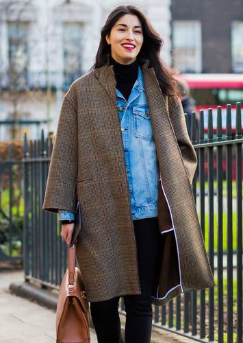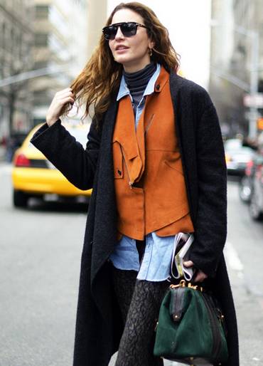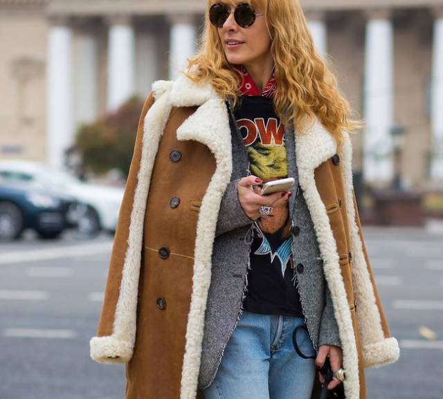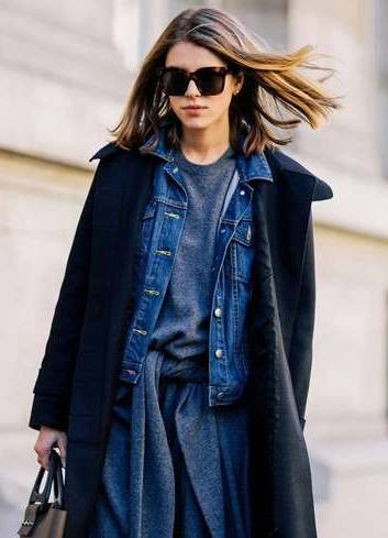 牛仔衣搭配棕绒皮衣,再搭配黑色大衣显得特别有质感。层层叠加,却一点也不臃肿。看到的尽是一个时髦精的精心搭配。