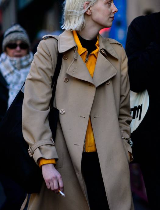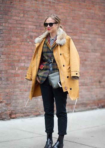 不想只穿经典的黑色皮衣也没关系,彩色皮衣照样可以穿出时髦!具有秋冬气息的“落叶黄色”皮衣搭配卡其色风衣,十足的呼应了当下的季节,也特别出彩。