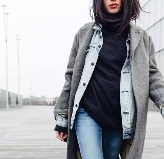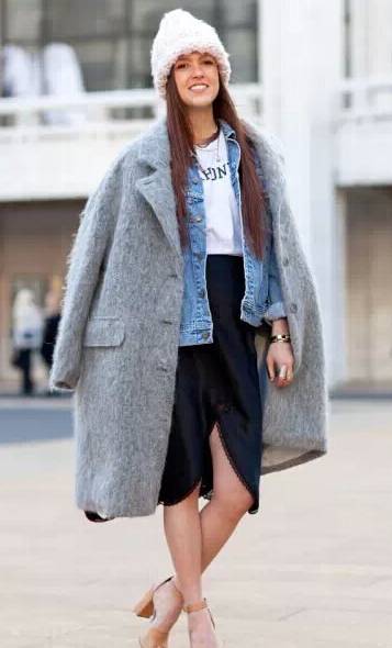 上身短牛仔外套搭配灰色毛呢大衣,下身搭配分叉裙,层次分布有序,彰显不一样的女人味。
