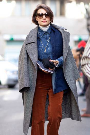 上身双层牛仔衣搭配呢子大衣,下身棕色灯芯绒裤,层次错落有致,不会感觉很臃肿,反而让人一眼就觉得你是个会穿的时尚达人。