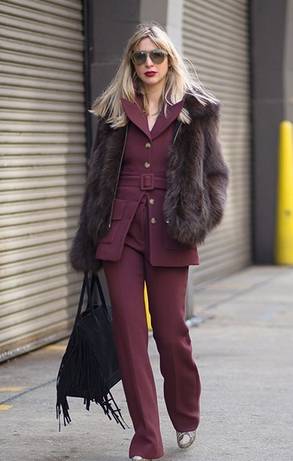 酒红色西服套装很显档次,不过单穿有点单薄了。外加一件小皮草,低调的奢华不过如此了。