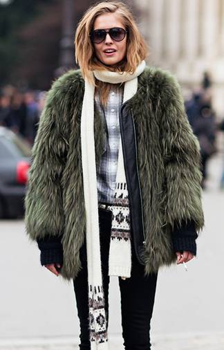 格子衫搭配黑色皮衣,再搭配一件墨绿色皮草很有质感。如果你还觉得少点什么,可以加一条小小围脖,整体造型挑不出毛病,就是好看。