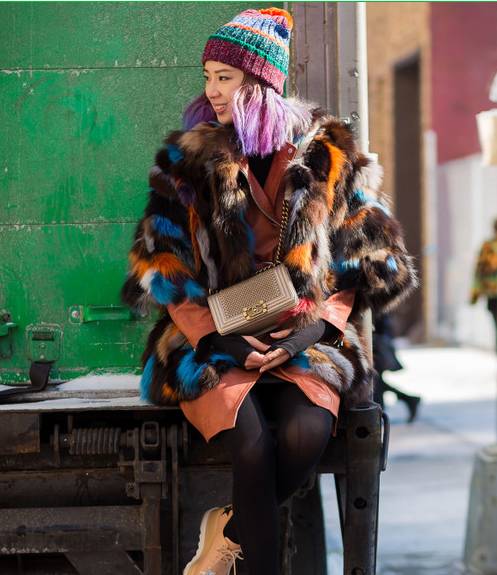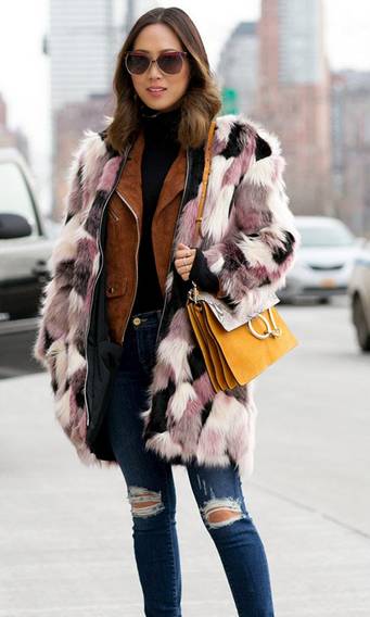 喜欢鲜艳颜色的妹子们也可以尝试上面的穿搭法,黑色打底衫搭配棕茸皮衣再搭配一件粉嫩拼色皮草,突显优雅的造型感,也特别适合日常穿。
