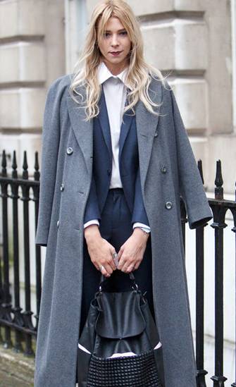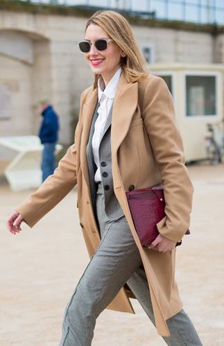 灰色呢子大衣再普通不过,不过内搭上白衬衫和西服套装的组合就完全不一样了。整体造型不但不显臃肿,还特别显瘦。