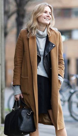 灰色打底衫搭配黑皮衣,搭配卡其呢子大衣很适合。柔和的色彩也为寒冷的冬季注入一股暖流。
