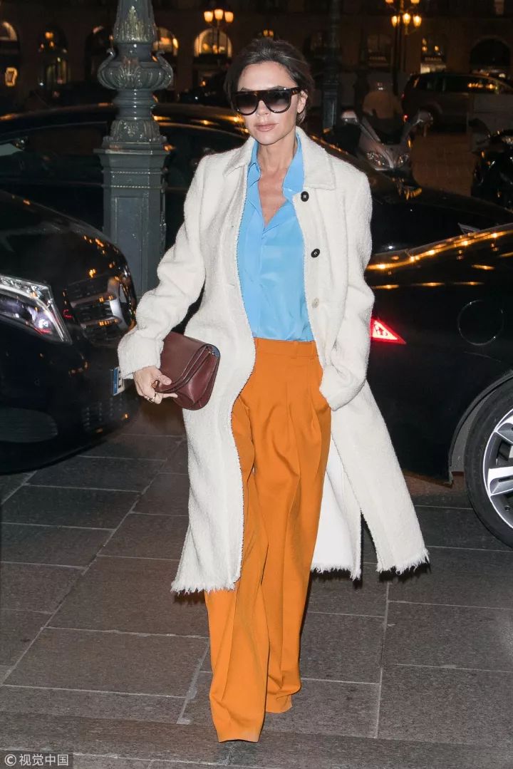 ▲白色长款外套内搭浅蓝色衬衫,下穿黄色阔腿裤长裤,也可以像贝嫂一样将扣子解开到恰当处,小慵懒的性感最是好看。
