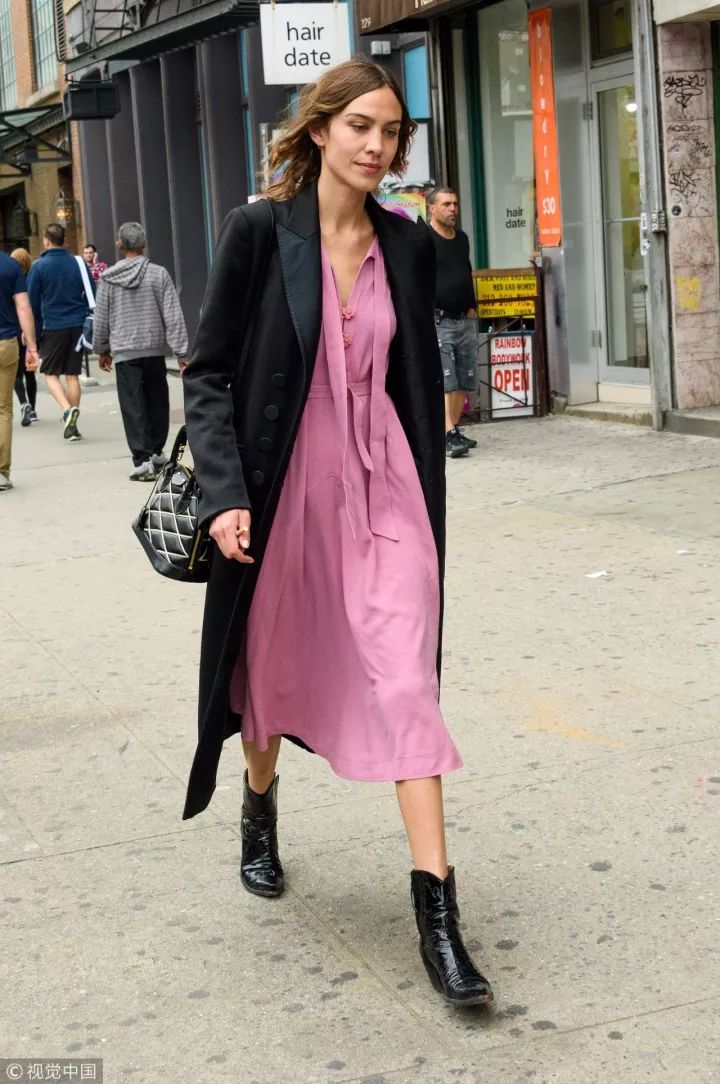 ▲时尚博主钟小姐Alexa Chung就身穿黑色西装呢大衣,内搭粉色飘带长裙,脚踩黑色漆皮尖头踝靴,吸睛的连衣裙为沉闷的秋冬带来了无限的活力和女人味。