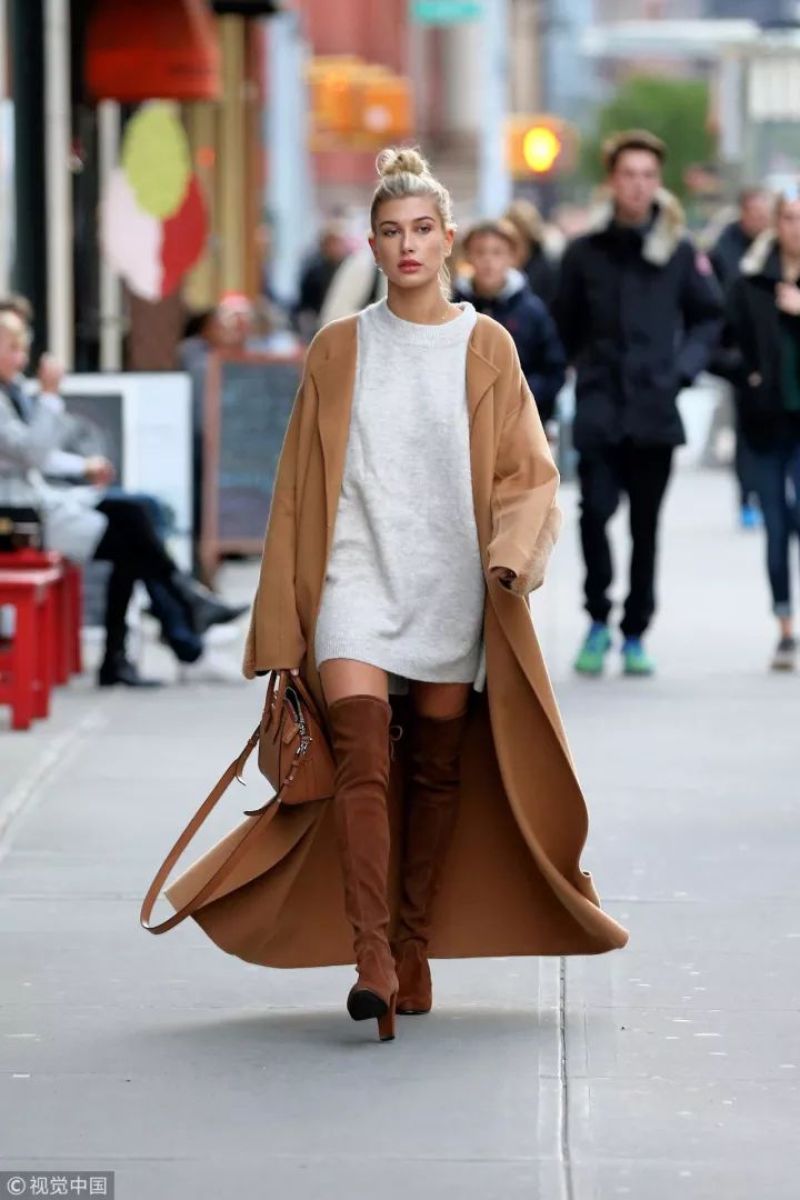 ▲或是学习Hailey Baldwin白色针织毛衣裙外搭棕色呢子大衣,脚踩深棕色麂皮高跟过膝靴,时髦又显瘦!