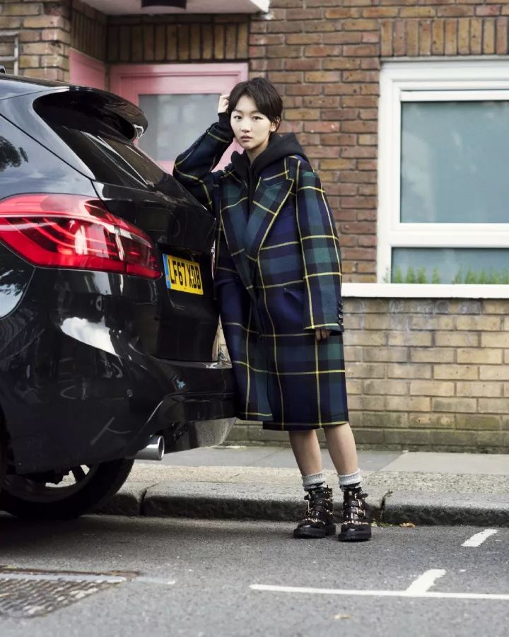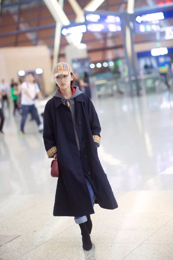 ▲周冬雨头戴Burberry苏格兰格纹棒球帽,身穿Burberry藏蓝色大衣内袋灰色连帽卫衣,下穿牛仔裤搭配黑色袜子靴,充满了无限趣味和活力。