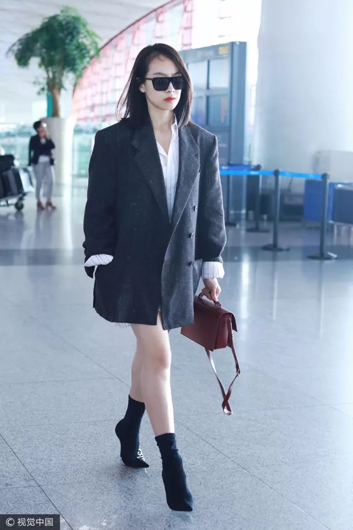 ▲宋茜的深灰色毛呢Oversize西装外套,内搭条纹衬衣,脚踩Balenciaga字母logo尖头高跟袜子靴,“下衣失踪”的茜茜气场全开。