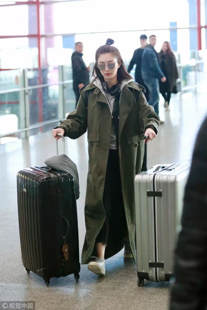 ▲江疏影这套墨绿色长款风衣外套,内搭黑色机车皮夹克和Calvin Klein灰色连帽卫衣开衫,秋天玩过的搭配外搭大衣,轻松不费力。
