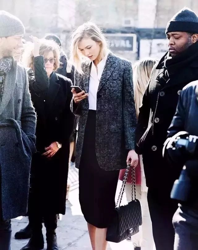 ▲白衬衫还可以搭配裙装穿在大衣外套里。超模kk的铅笔裙干练利落又不失时髦有型。