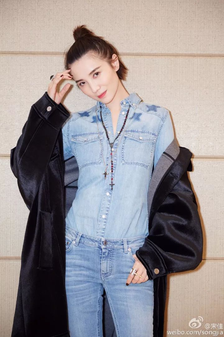 ▲宋佳的Givenchy星星牛仔衬衫搭配同品牌牛仔裤,外搭FENTY×PUMA 丝绒大衣,演绎今年流行的denim on denim全身牛仔。