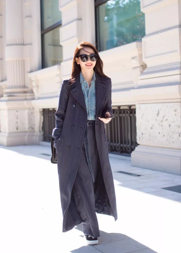 ▲MaxMara长款大衣内搭同品牌牛仔衬衫,下穿MaxMara阔腿长裤,戚薇的这一套兼顾职业和休闲,稳重而有气场!