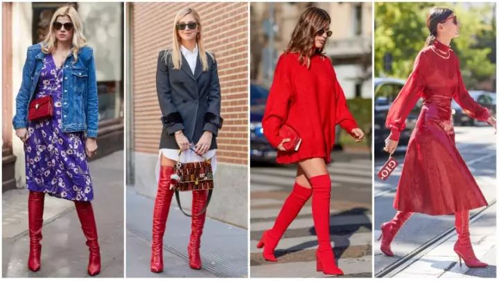 过膝靴这两年来都十分的受欢迎,而今年红色的过膝靴更是全面袭来,抓眼又带着一丝小性感,穿上它不用担心会被人群淹没,在搭配上,无论是搭短裙长裙,还是玩转下装失踪,它都可以很好的hold住,一身红的配色,也是一种很好的穿法,十分的吸睛。