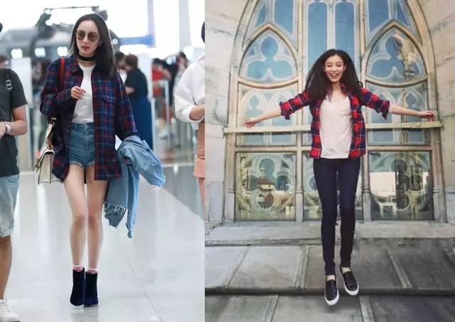 大幂幂和倪妮不约而同的用简约白T搭配格子衬衫,这种叠穿法最常见,相比于直接套上衬衫的穿法也更出彩,不过大幂幂的 Look 更胜一筹,长款衬衣搭配短裤层次感十足,大夏天的把衬衫穿在T恤外还能防晒!