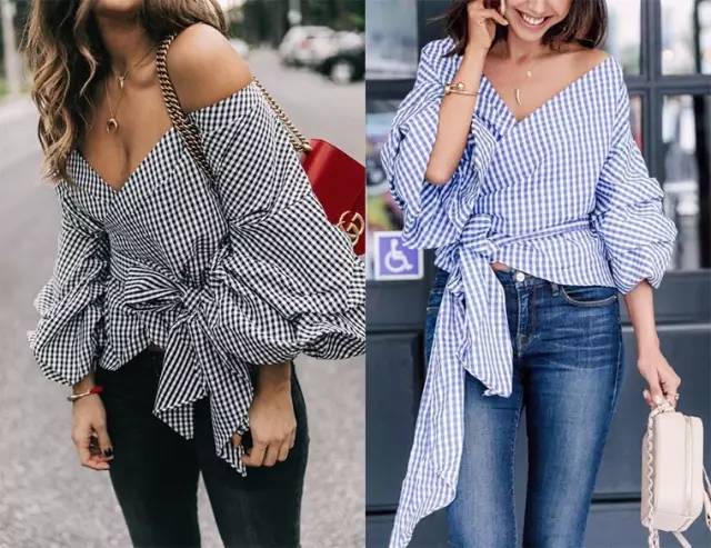 围裹式的衬衫设计今年是大热,V领设计拉伸颈部线条,收腰设计突出曲线,格子的性感花样,你 Get 了吗?!