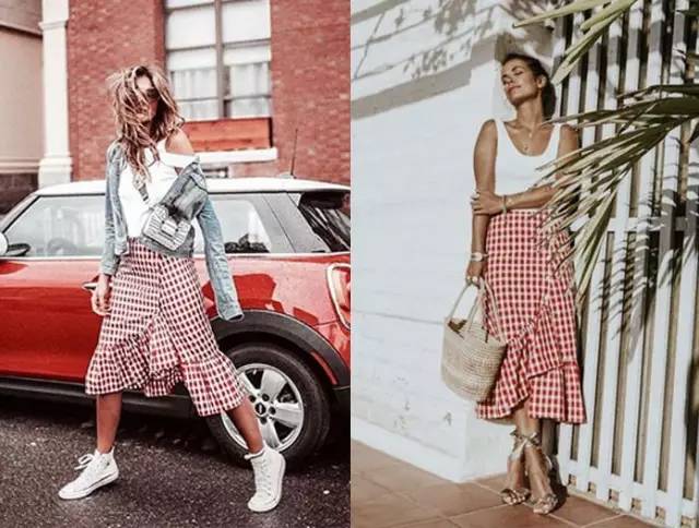 除了传统素面格纹,这种俏皮式格纹图案色彩鲜艳,少女感更浓郁一点,在热情的 Summer 里更显活泼,也是不错的选择。