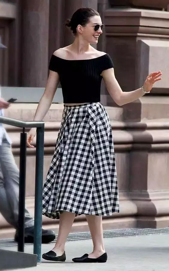 安妮·海瑟薇身着紧身露肩上衣搭配格纹裙,尽显复古的优雅气质。