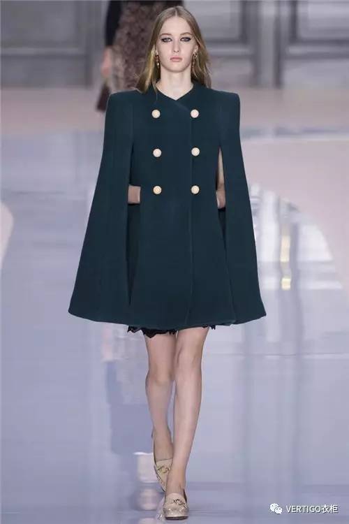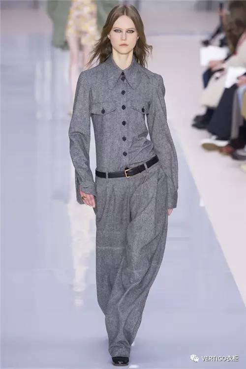 2017秋冬系列中,Clare WaightKeller运用了许多大方格纹、小碎花元素、条纹和色块拼接,在肩膀上做出圆润的廓型、落肩设计。